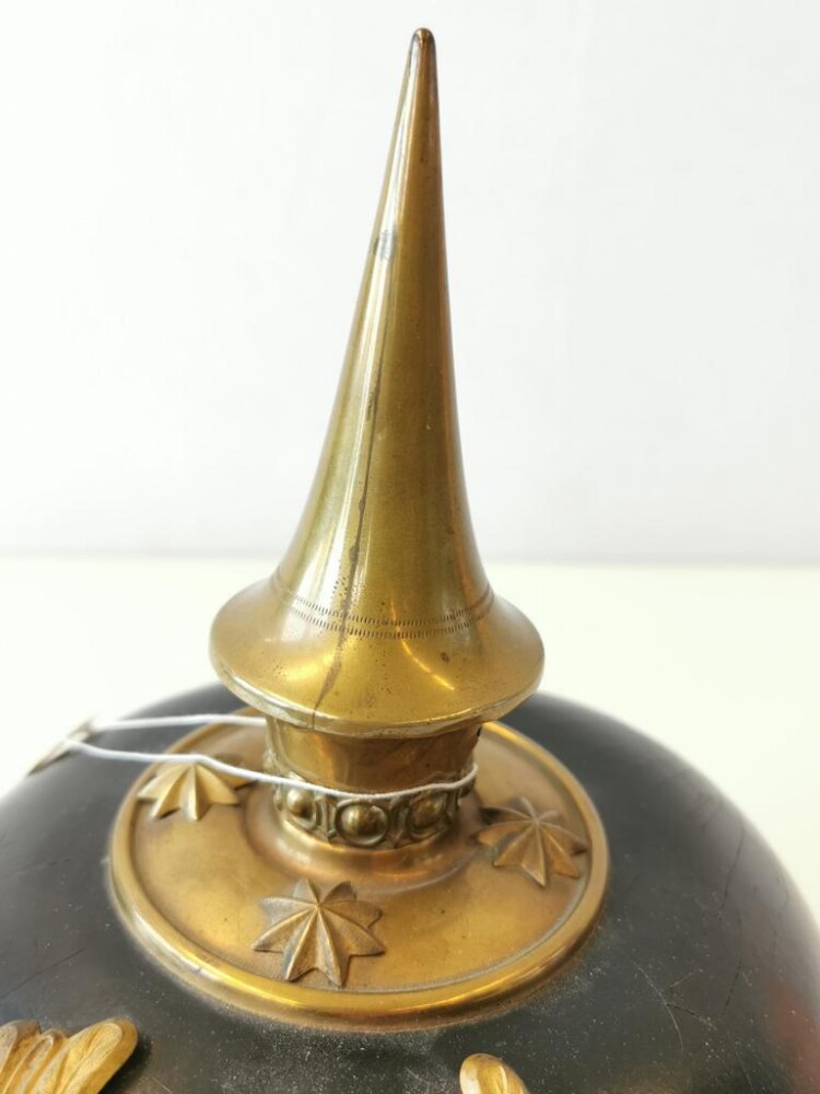 Es ist eine metallene, teamfarbene pickelhaube, die ähnlichkeit mit den von der preußischen armee hat und in propaganda und fiktion, mit denen des deutschen militärs. Die spitze teilt unter keinen umständen schaden aus. Doch sie krönte nicht nur alle untertanen der preußischen militärmonarchie, sondern sie zeigte auch ihre diffizilen unterschiede. Absolut seltene offizierspickelhaube des zweiten preussischen kürassierregiments in sehr gutem und unberührten zustand, traumhelm.